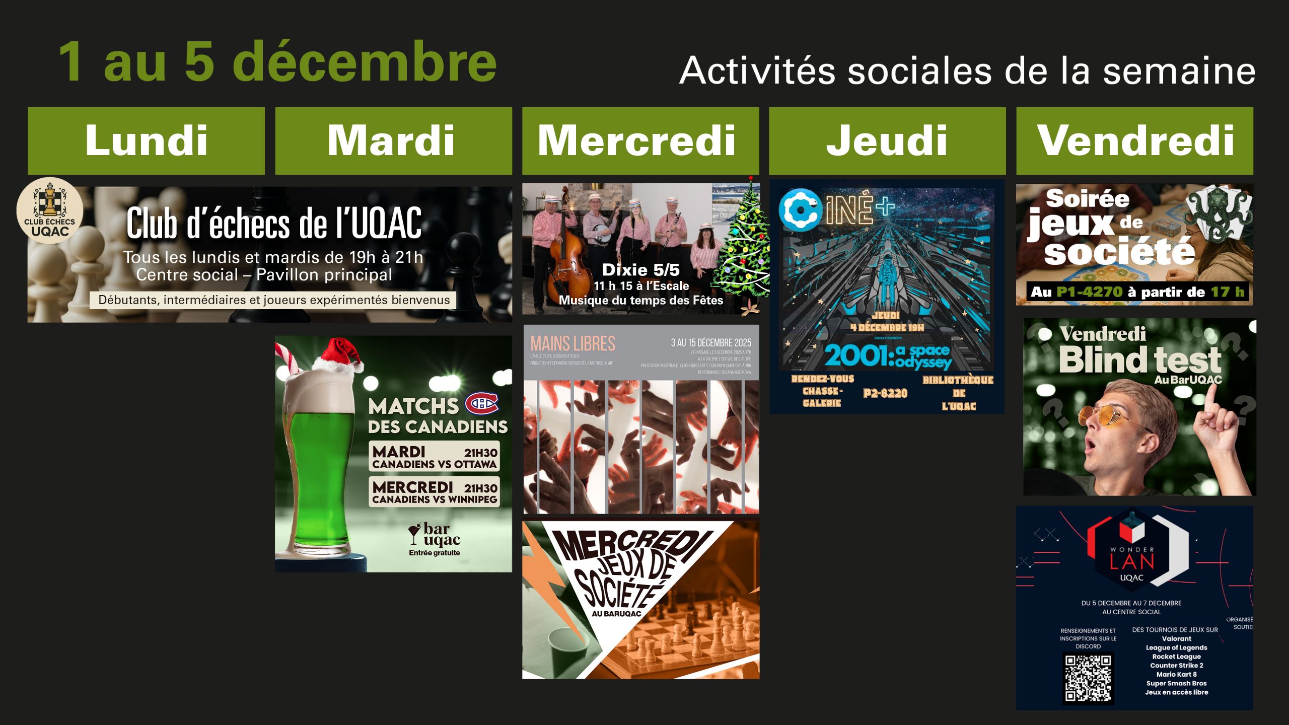 Matchs des Canadiens / Spectacle des Fêtes / Vernissages / Lan party / soirées de jeux de société / et encore + staillo@uqac.ca