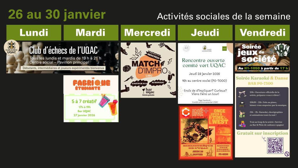 Match d’impro / Soirée Karaoké / 5 à 7 créatif / Comité vert / et bien plus!
