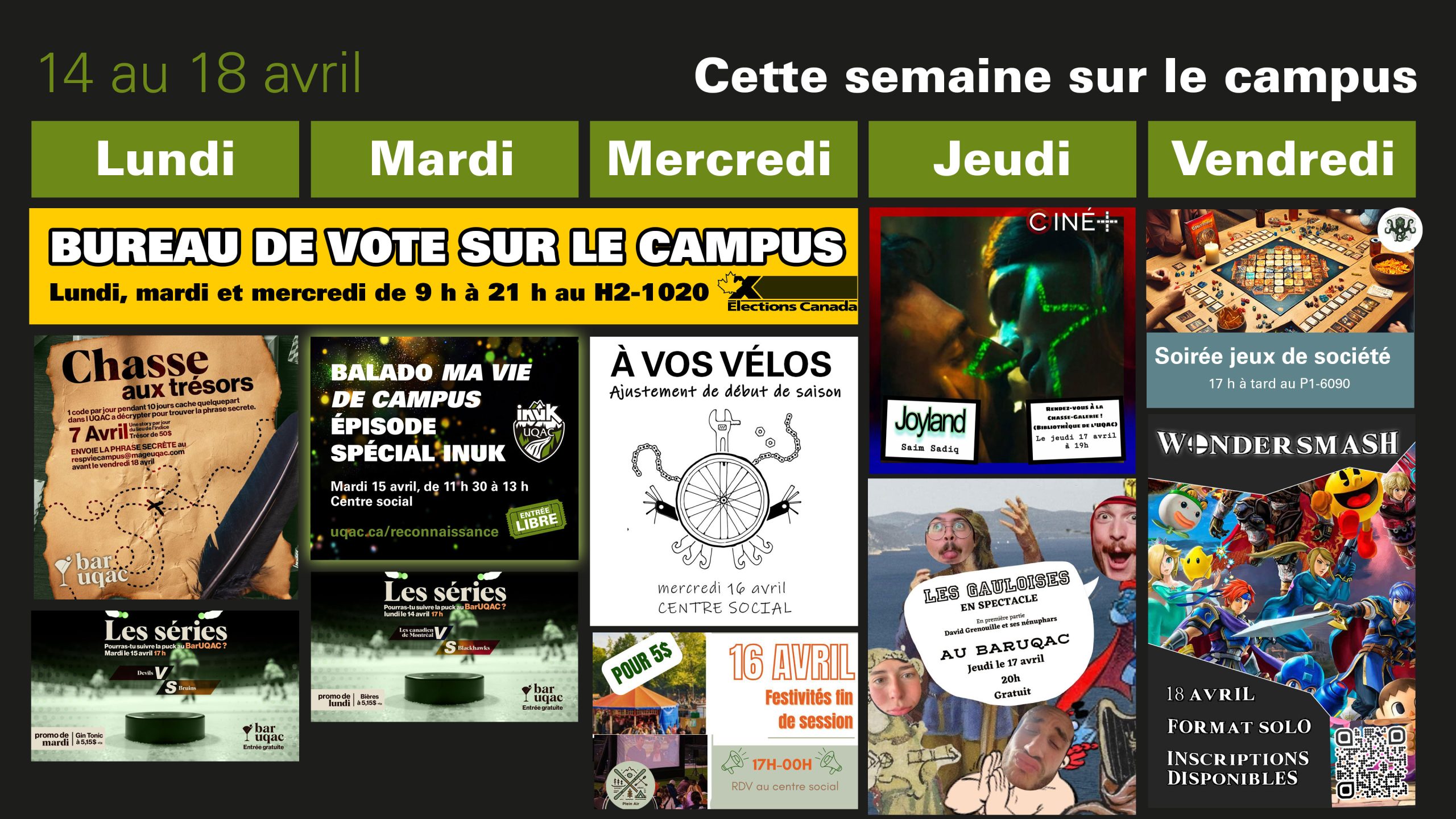 Bureau de vote sur le campus // Spectacle du groupe étudiant « Les Gauloises » // Festivités de fin de session du SPAU // Ciné+ // et bien plus encore!