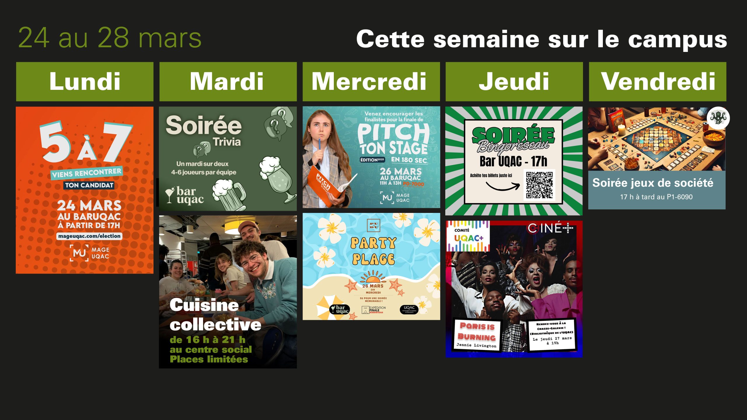 PU au BU // Pitch ton stage // Menu de la cafétéria // Cinéclub étudiant // Élections du MAGE-UQAC // Bingo réseau // et plus encore!