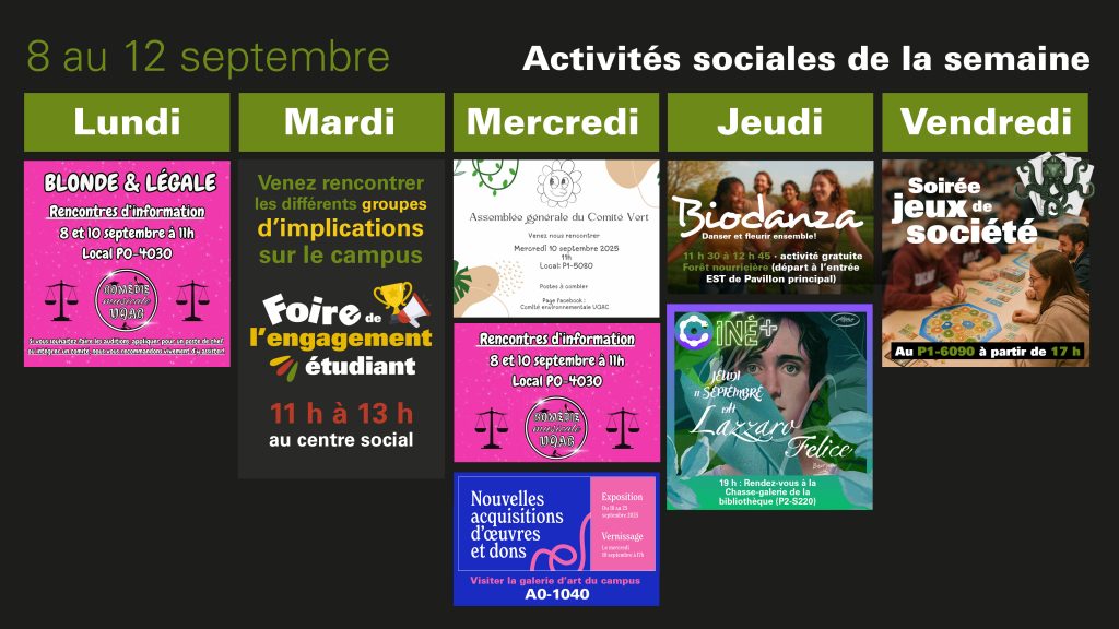 Foire de l’engagement / Comité musicale UQAC / Biodanza / Vernissage / AG comité vert / Ciné+ et plus encore!
